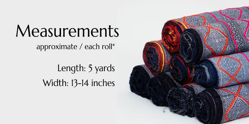 These colorful rolls of embroidered fabric are sourced from hill tribe communities in Southeast Asia. The fabric features a stamped indigo batik design, which is then uplifted with some embroidered colors, namely hot pink and bright orange. These colors are often used by the Flower Hmong tribe, who are known for their colorful and bright embroidery and clothing designs.