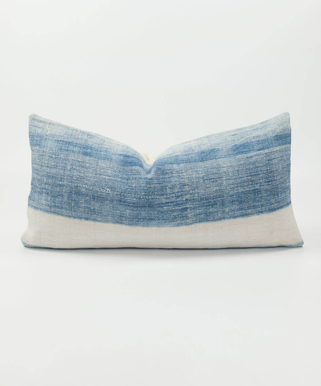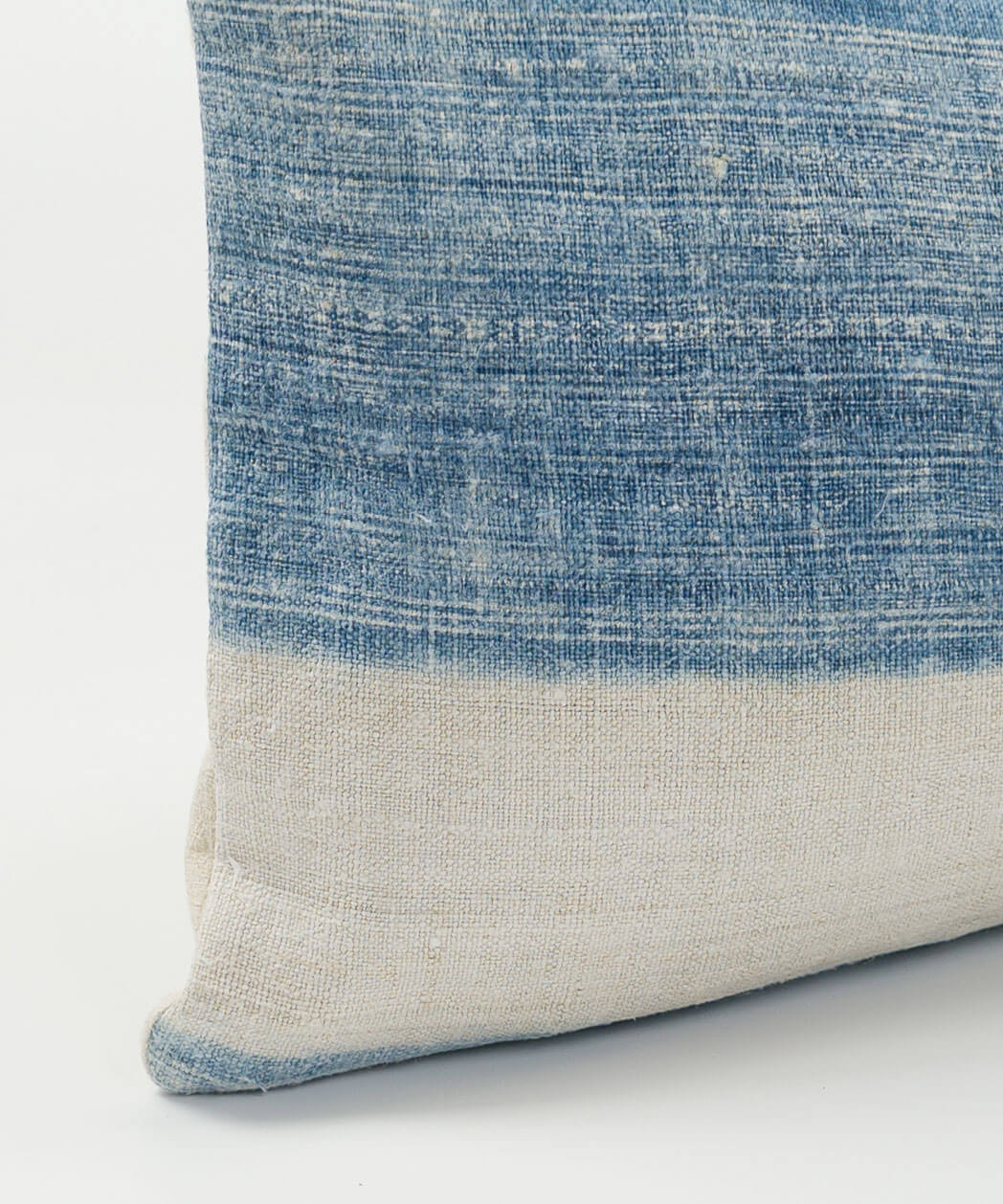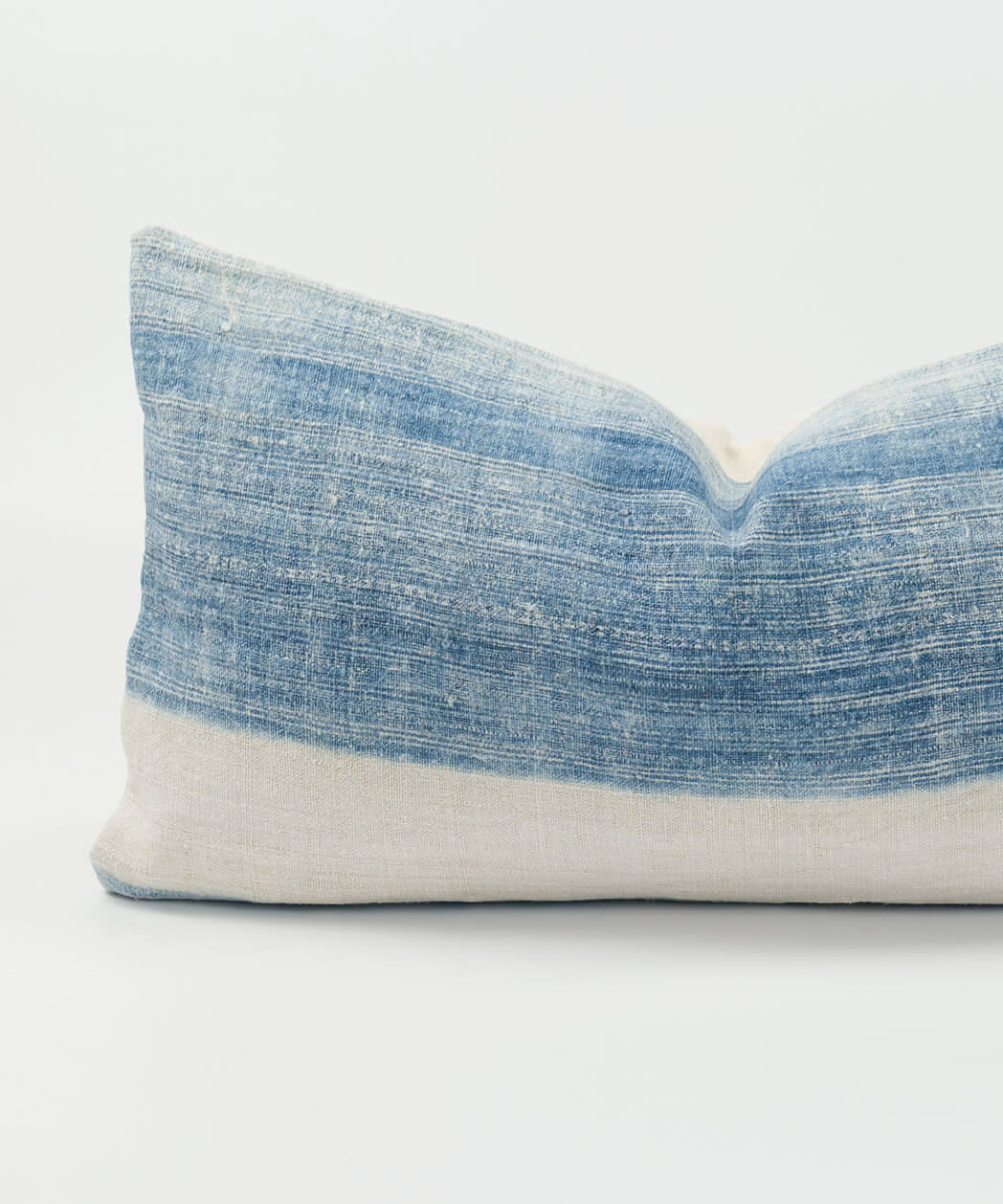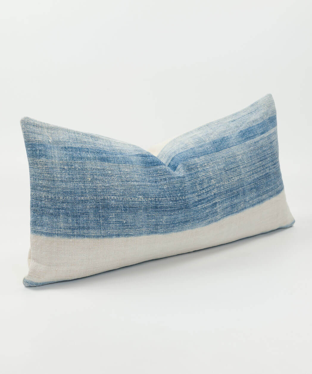 The fabric features still-visible batik patterns, which were applied during the dyeing process where leaves from the indigo plant were used to create a deep indigo shade. Today, the shade of indigo has lightened considerably, resulting in a vibrant ethnic pillowcase that catches the eye.