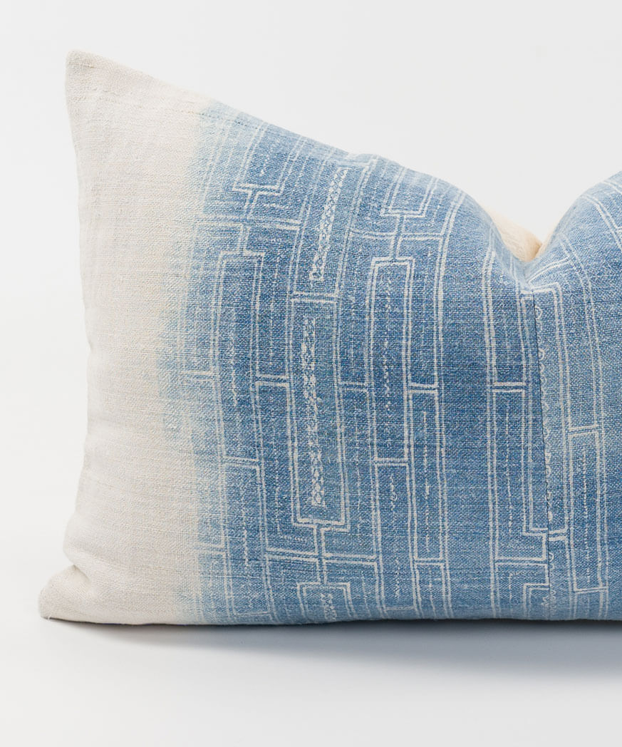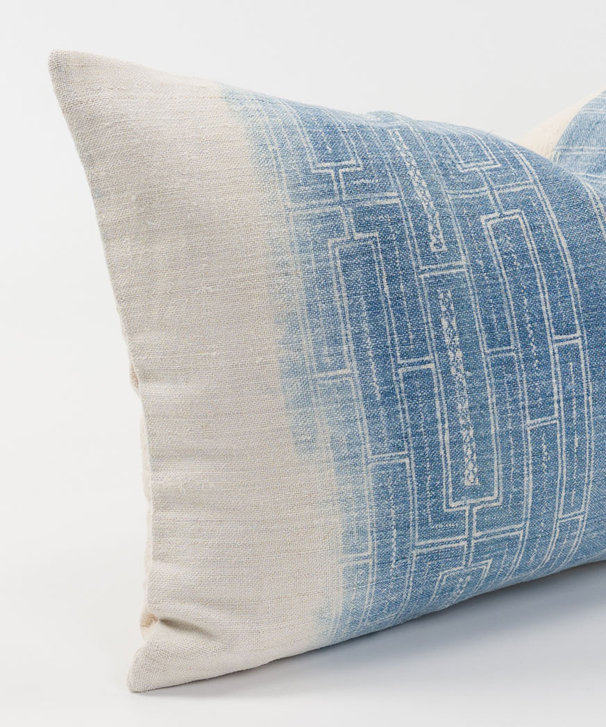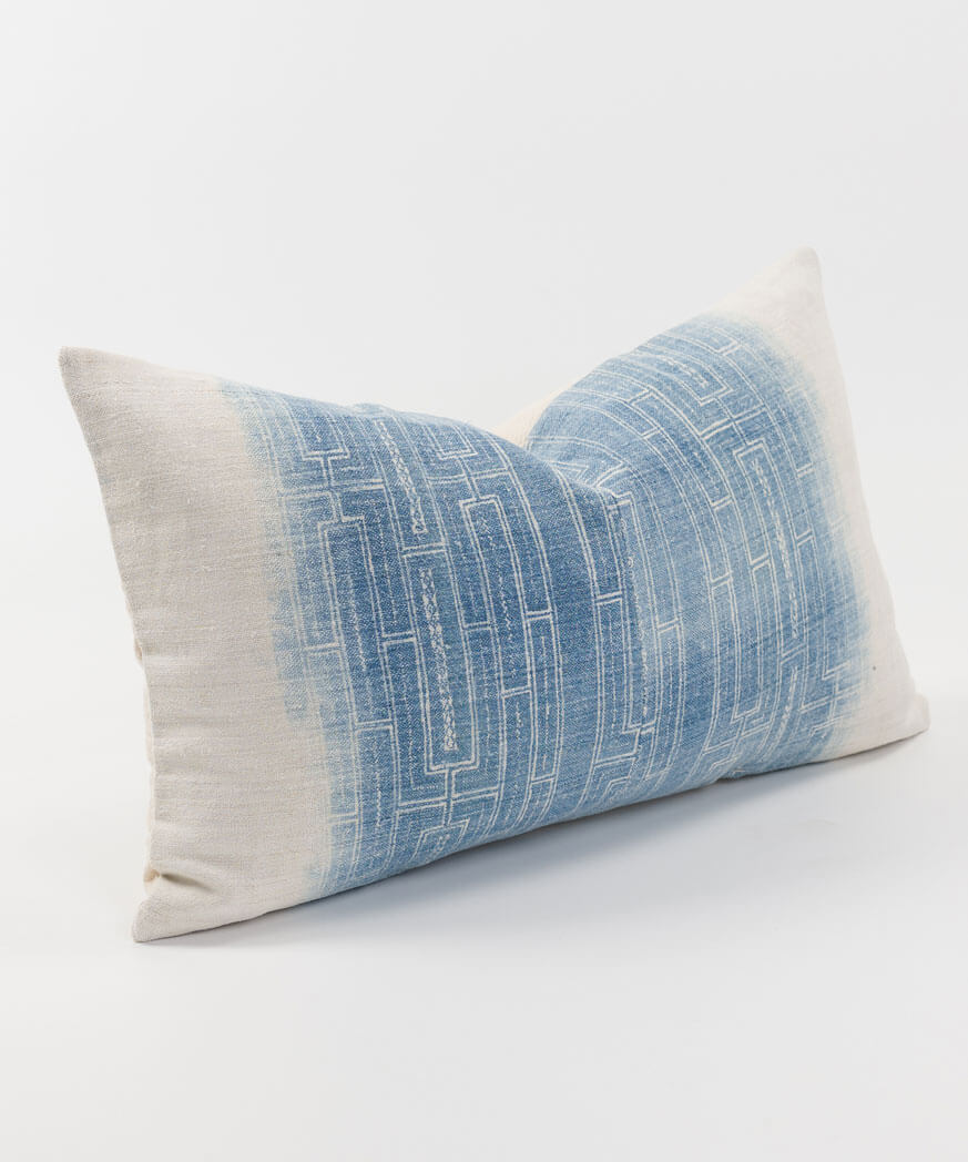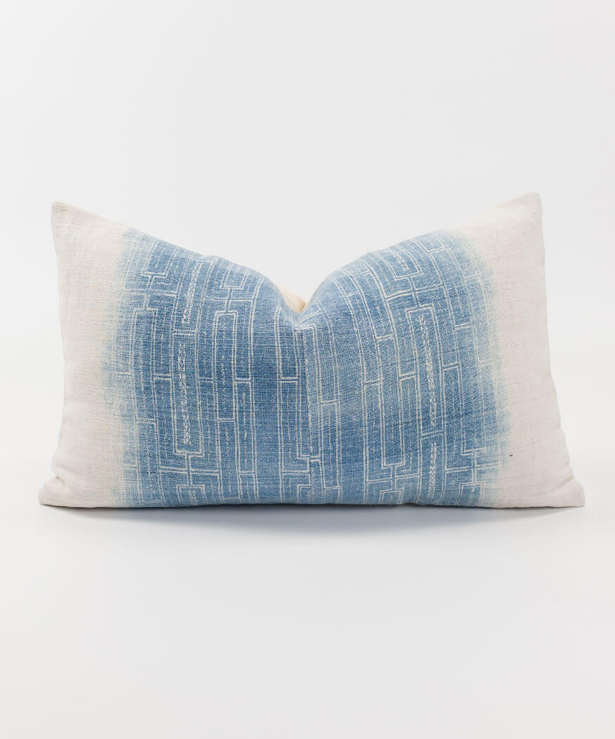 What makes this hemp lumbar cushion so special is the beautiful weathered fade. The indigo dye hue, once deep and dark, is now light and airy – almost baby blue in color. These light tones, white batik patterns, and a cream-colored reverse make for a fantastic neutral accent cushion.