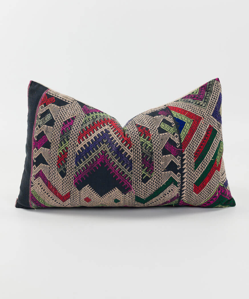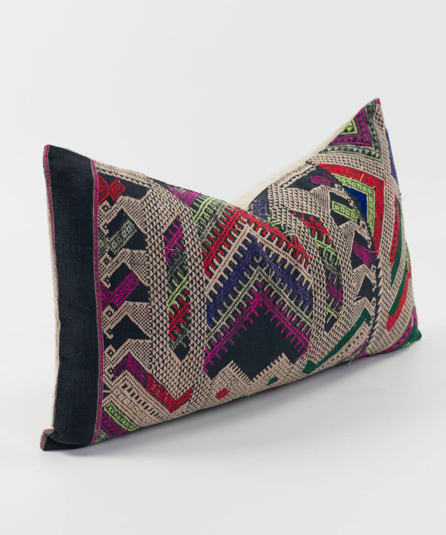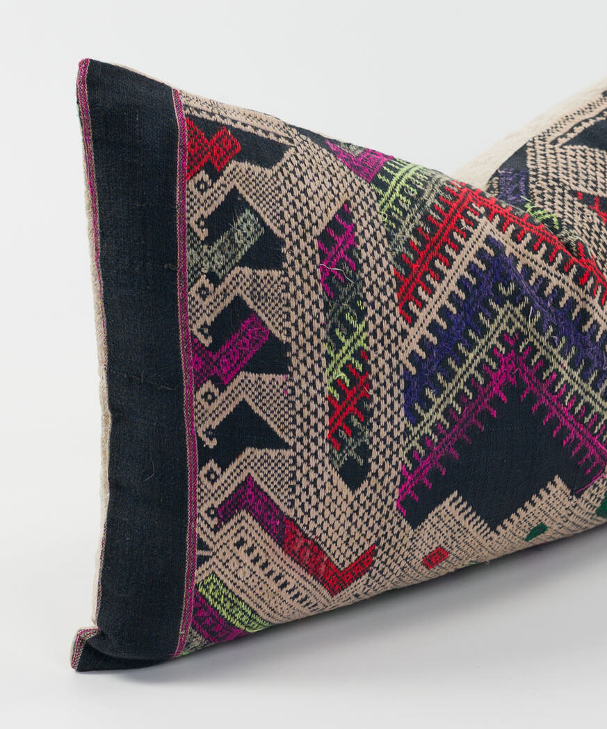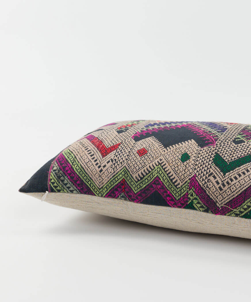 This ethnic pillow cover features a rare textile that we’ve sourced from the Tai Lue hill tribe. Its original form was that of a woven blanket, which had gained holes and wear over several decades. We cut out sections that were in relatively good condition and created the pillow cover you see before you.